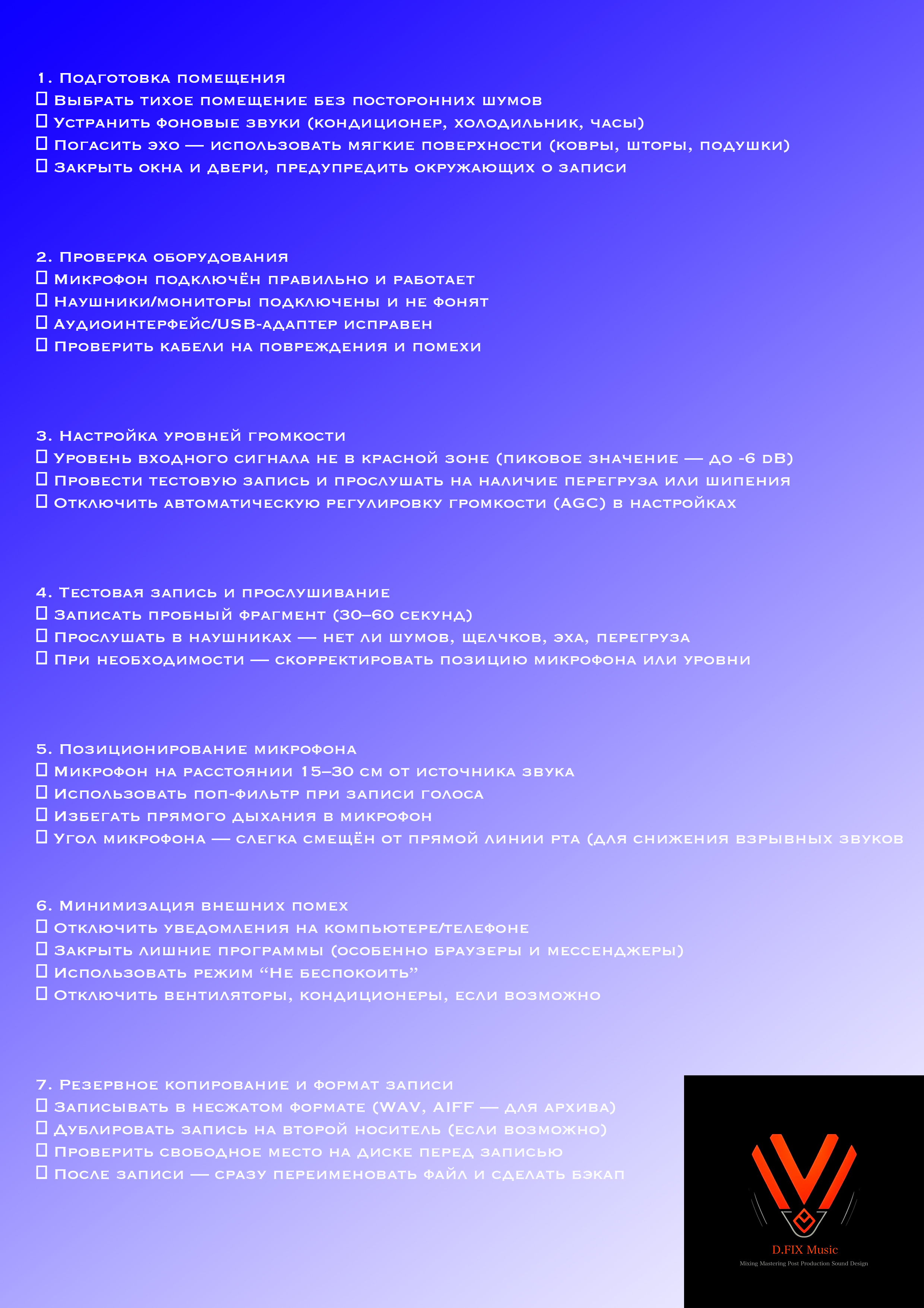 → Решение: всегда записывайте в **24-bit / 48 kHz WAV — это стандарт для кино и рекламы.